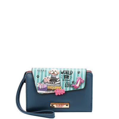 CARTERA ESTAMPADA DE MÚLTIPLES COMPARTIMENTOS CON SOLAPA Y MUÑEQUERA I LOVE TO TRAVEL